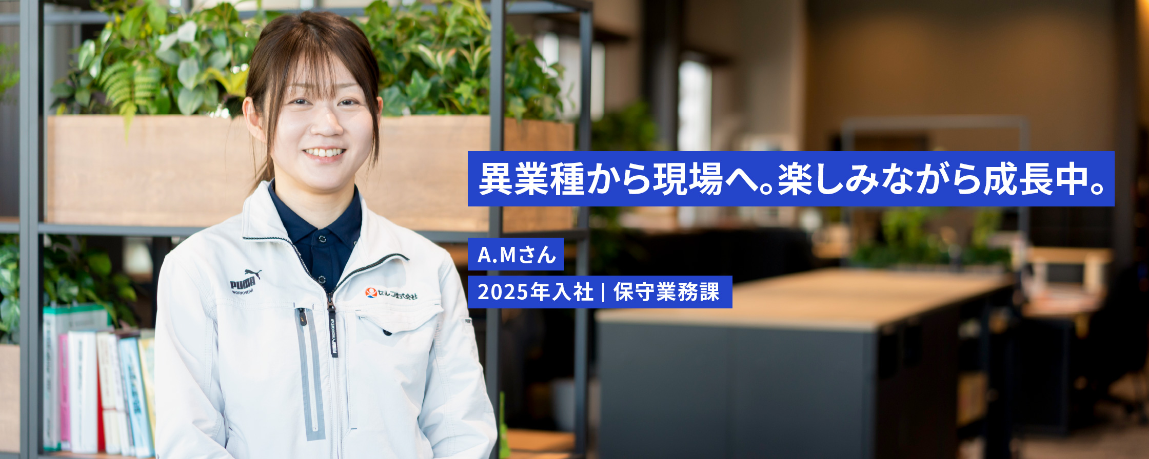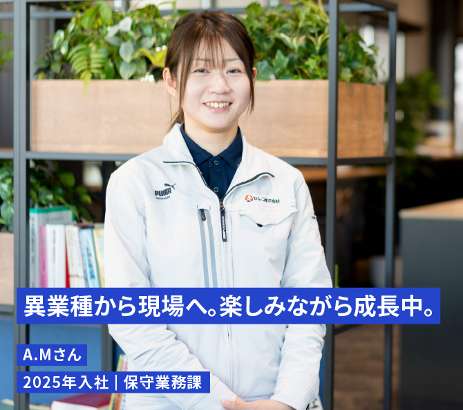 未経験からでも、大きく成長できる場所。 先輩方が本当に良い方ばかりで、事務所の雰囲気もとても良いです。転職では「自分に務まるのか」「どんな人と働くのか」など、不安に感じることも多いと思います。私も同じでしたが、先輩が気軽に声をかけてくれたおかげで自然と会話に入ることができ、すぐに安心できました。入社して半年ほどで社用車が割り当てられ、自分で現場に向かうようになるのですが、今でも勉強になる現場があれば先輩が声をかけて連れていってくれます。半年という区切りはありますが、その後も継続してサポートしてもらえる環境です。また、資格取得のサポートが手厚いところも当社の魅力です。手当などの制度だけでなく、先輩から試験や勉強のアドバイスをもらえたり、同僚と情報共有したりできるので心強いです。 この会社は異業種から転職してきた人が多いそうです。私の先輩方も未経験からスタートしていますが、今ではその方がいないと仕事が回らないというほど活躍されています。未経験でもできるか不安に感じている方も、安心して挑戦してほしいと思います。 |
