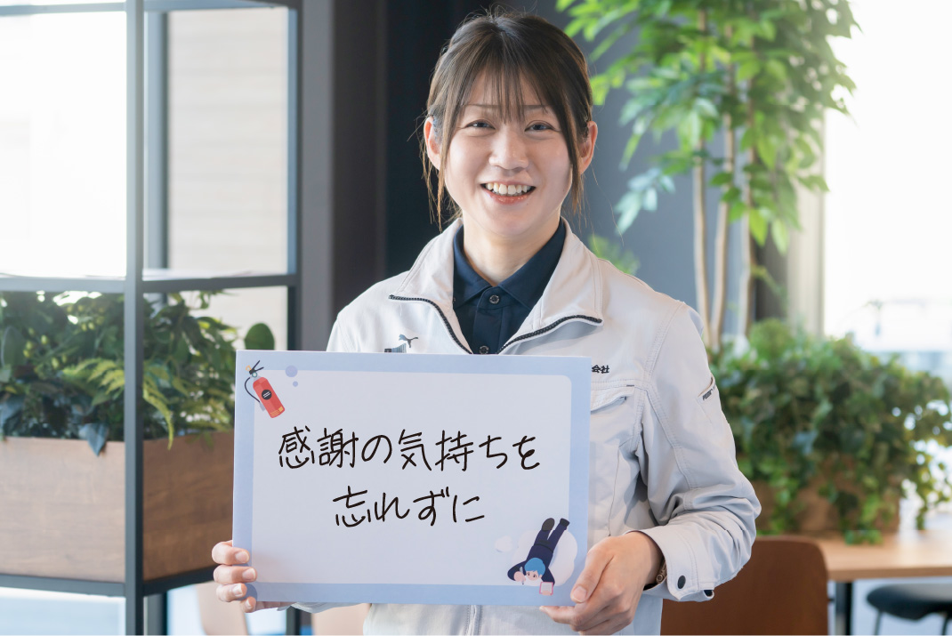 「感謝の気持ちを忘れずに」 お客様、協力会社の職人さん、自社の先輩方など、多くの方の支えがあって仕事ができていると常々感じています。私が困っている時には、先輩はもちろん、職人さんも声をかけてくれます。そうした人たちに対する感謝の心を常に持ち続けたいと思っています。現場は忙しく、なかなかゆっくりお話しする機会はありませんが、普段から「ありがとうございます」の一言を大切にしています。また、当社の企業理念は「愛、感謝、誠意」であり、感謝の心を持つことは会社の行動指針でもあります。日々、感謝の心を忘れず、仕事や勉強で恩返ししていきたいと思います。 |